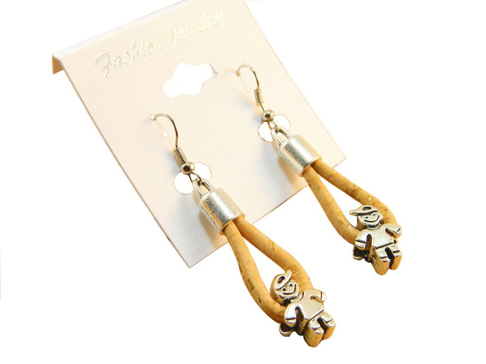 Beautifully hand crafted pendant alloy boy cork jewelry earrings is made predominantly from cork and zinc alloy. The style of these earrings making it unique and strikingly alternative to traditional jewelry designs.