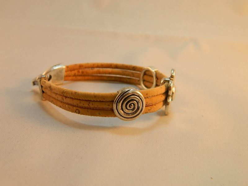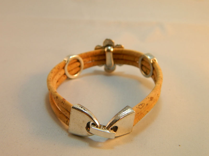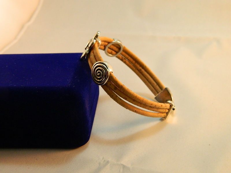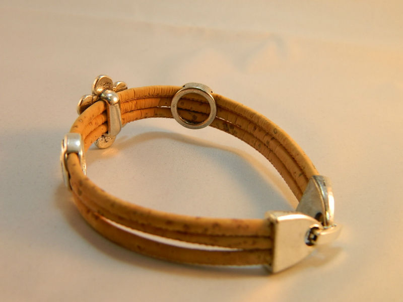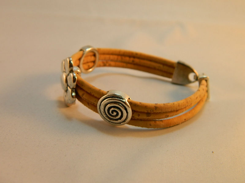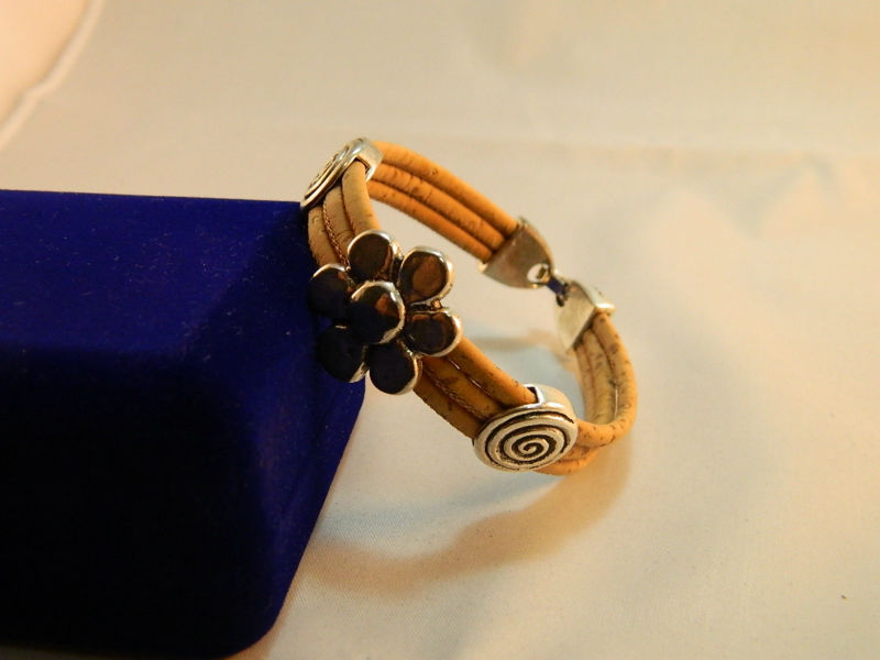 Beautifully hand-crafted three ropes with silver-white flowers bracelet is made predominantly from cork and zinc alloy metal. The style of this bracelet making it unique and strikingly alternative to traditional jewelry designs.