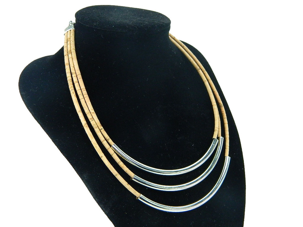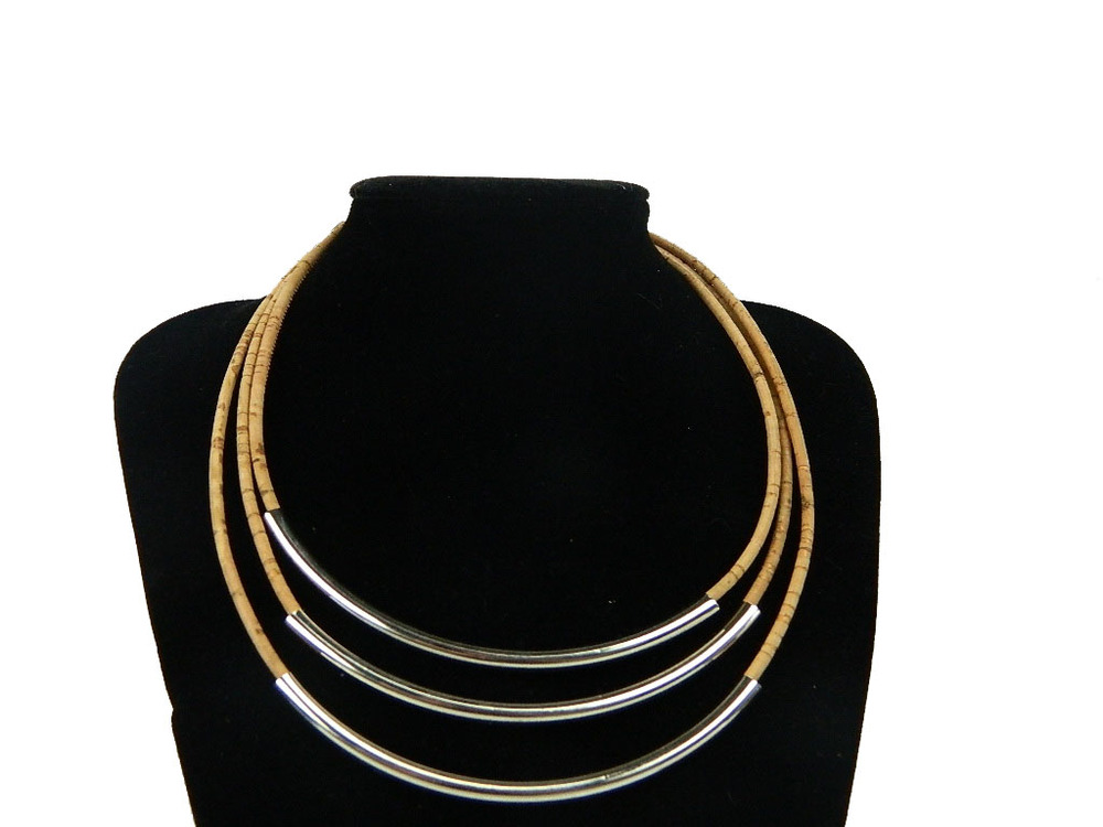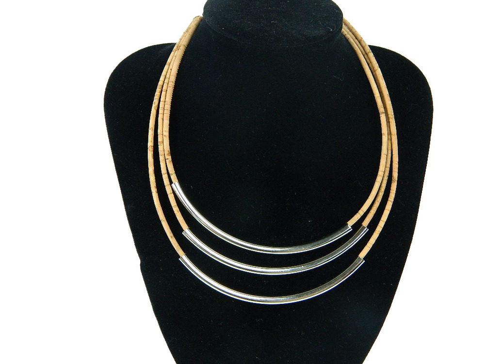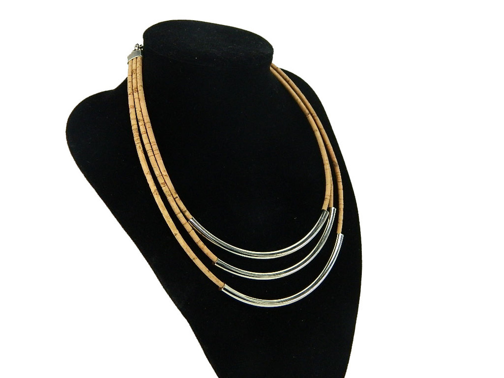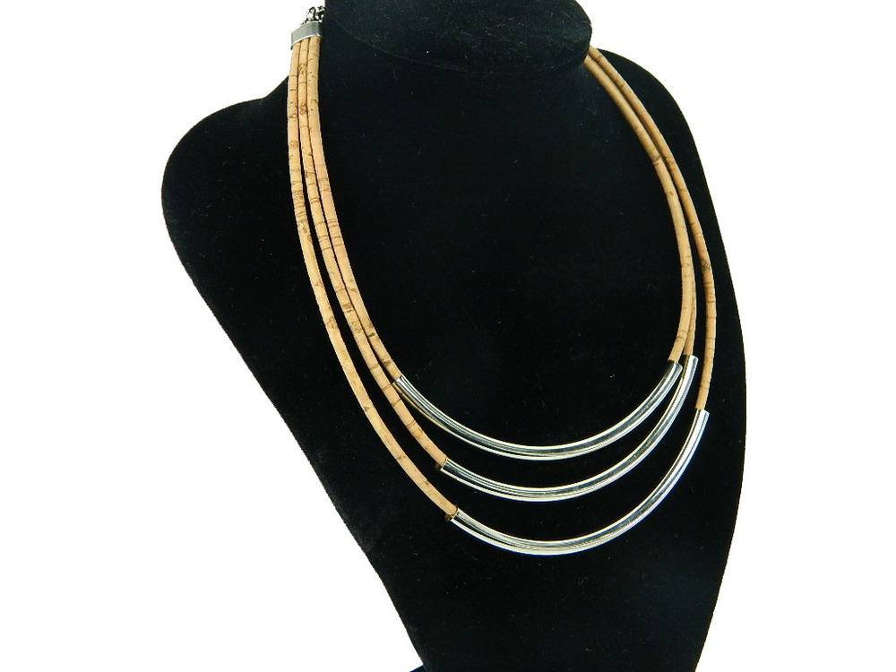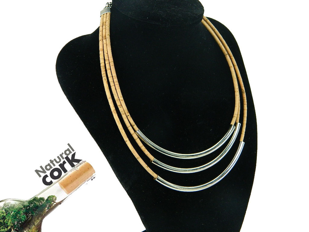 Beautifully hand crafted three ropes with three alloy pipes and link chain, necklace is made predominantly from cork and zinc alloy.The style of this necklace making it unique and strikingly alternative to traditional jewelry designs.