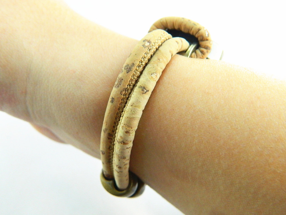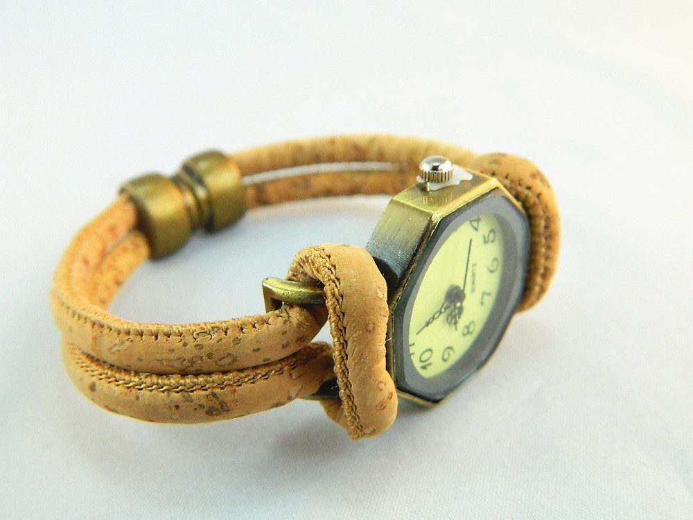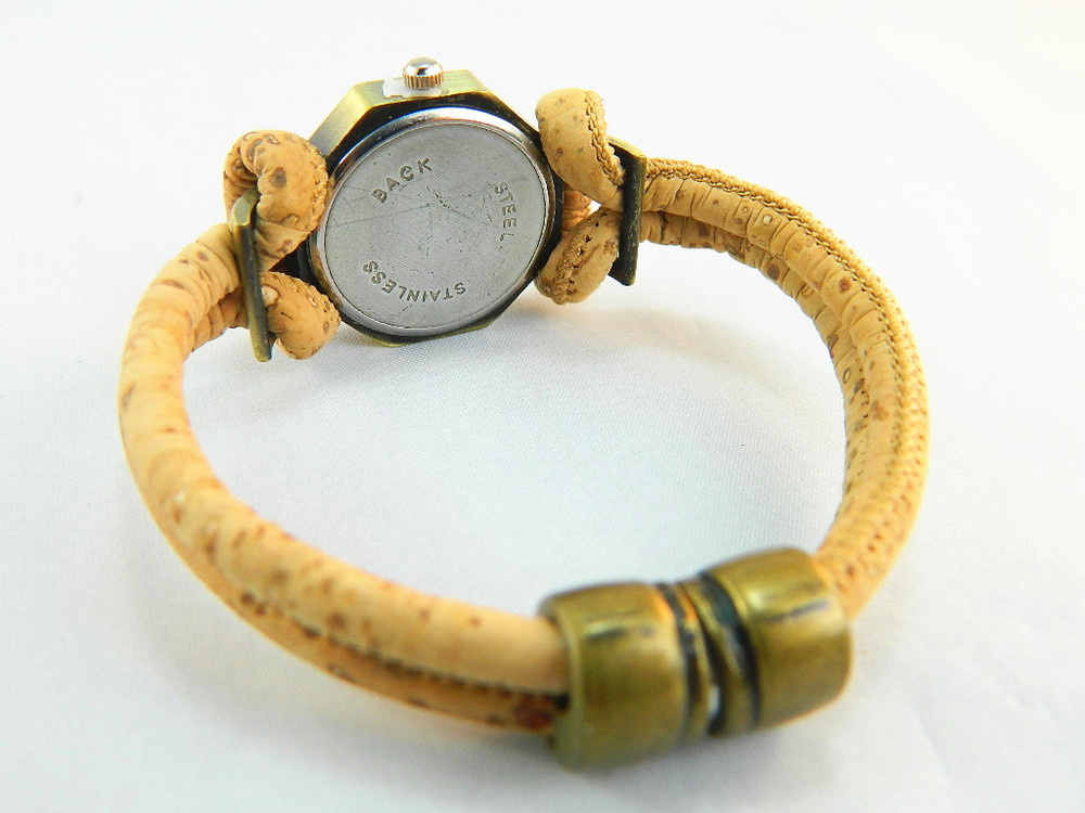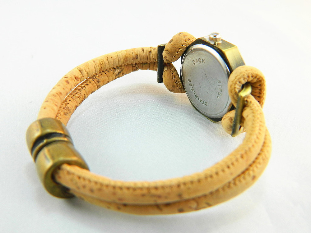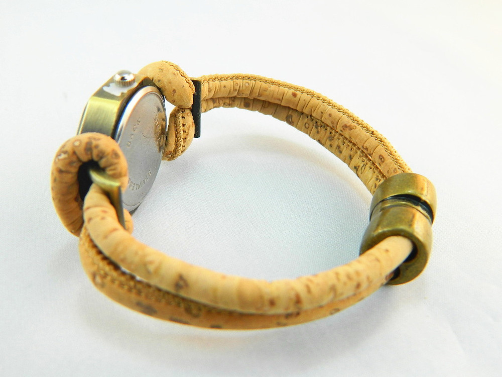 Beautifully hand crafted two ropes and bronze dial cork wrist watch is made predominantly from cork. It is a natural material, each product made from it is subtly unique and the delivered item may differ slightly in their color and grain.